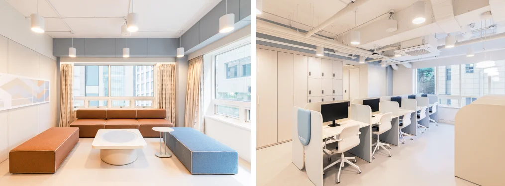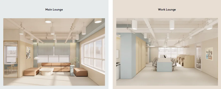 메인 라운지는 방문자를 맞이하고 교류가 이루어지는 소셜 공간으로, 천장을 노출해 공간감을 확보하고 하늘색 구조 프레임을 포인트로 활용해 브랜드 무드를 형성했습니다. 반면 워크 라운지는 조도를 낮추고 좌석 밀도를 높여 몰입 환경을 조성했습니다. 서로 다른 목적을 가진 두 공간은 대비를 이루면서도 하나의 흐름 안에서 자연스럽게 이어지도록 계획했습니다.