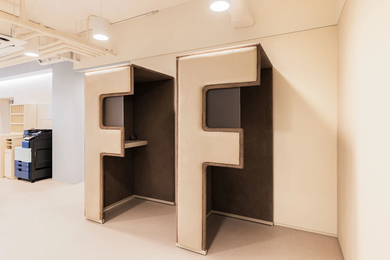 학동2호점에는 기존 지점에 없던 스탠딩 워크존이 새롭게 도입되었습니다. 서서 간단히 기록하거나 전화하면서 짧게 업무에 집중할 수 있는 공간입니다. 특히 파티션을 패스트파이브의 ‘F’를 형상화한 형태로 디자인하여, 기능적 활용은 물론 브랜드 아이덴티티를 직관적으로 드러낼 수 있도록 하였죠. 작은 공간이지만 브랜드를 경험할 수 있는 시그니처 요소로 완성했습니다.