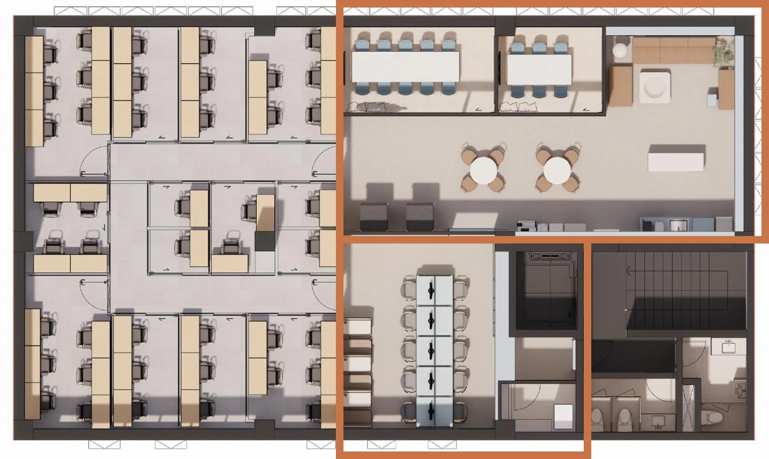 라운지, 포커스존, 오피스, 미팅룸이 연속된 흐름 속에 배치되어, 기능은 구분되지만 시각적으로는 자연스럽게 연결되도록 했습니다.