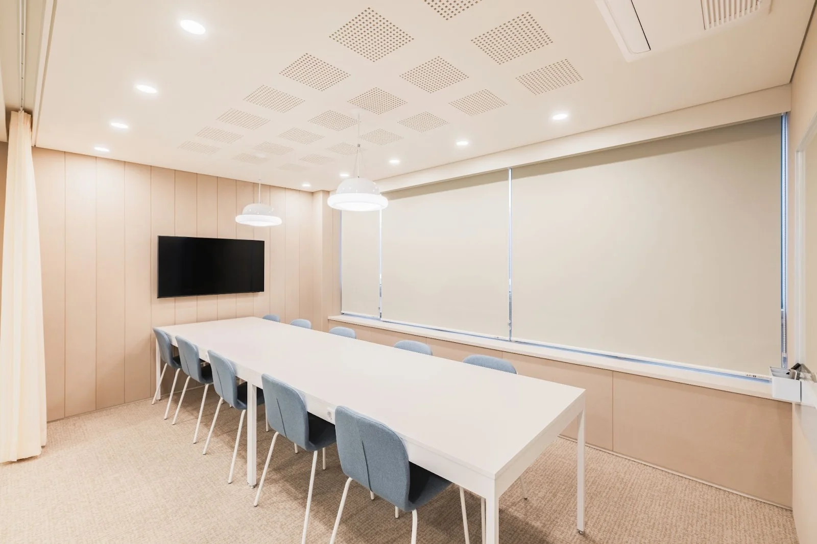 미팅룸은 규모와 목적에 따라 다양하게 구성했습니다. 벽면은 패브릭 마감을 적용해 흡음 성능을 확보했고, 백페인티드 글라스(유광)는 단정한 분위기와 관리 효율성을 더했습니다. 한쪽 벽면은 패브릭 패턴 벽체로 시선을 분산시키면서 깊이감을 확보해 따뜻한 분위기를 형성했습니다. 또한, 도어 손잡이는 시그니처 디테일로 제작해 브랜드 스토리를 강화했으며, 작은 요소까지도 공간의 정체성을 전달할 수 있도록 했습니다.