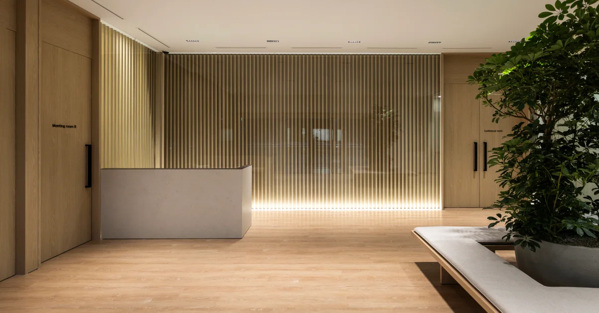 또한 벽면 곳곳에는 브랜드 철학이 담긴 레터링을 배치해, 공간 전체가 기업의 정체성을 드러내는 하나의 매개체가 되도록 설계했습니다. 우드톤과 아이보리 컬러의 조화는 신뢰감과 따뜻한 이미지를 동시에 전달합니다.